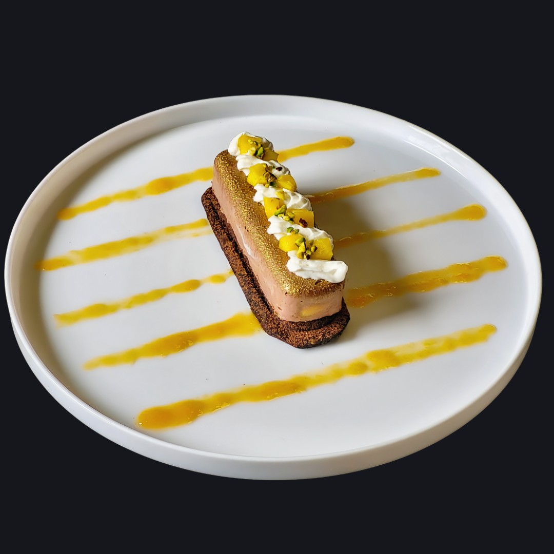 Questi dolci monoporzione al cioccolato sono dei dolci freddi formati da una base di pasta frolla al cacao e da un cremoso al cioccolato che racchiude una gelée al mango, il tutto su una coulis sempre al mango. Per decorare queste monoporzioni al cioccolato le ho ricoperte con polvere d’oro alimentare creando un effetto velluto e poi le ho decorate con panna montata, cubetti di fragole, granella di pistacchio e decorazioni di cioccolato. Insomma questi dolci monoporzione moderni sono davvero irresistibili.