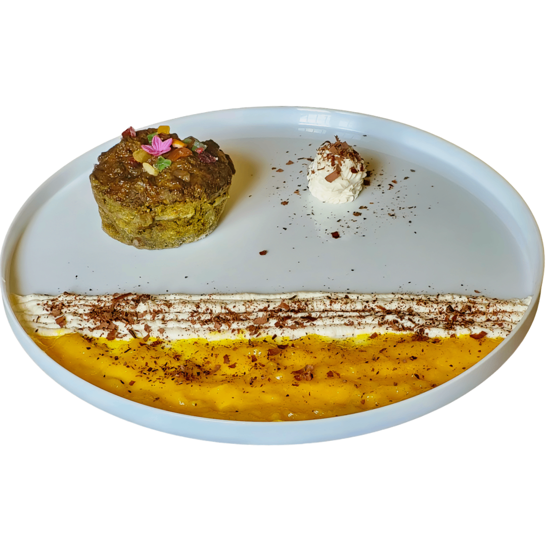 Lo accompagneremo con una SALSA AL MANGO ed un MASCARPONE totalmente vegetale. Il tutto completato con una decorazione al cioccolato.