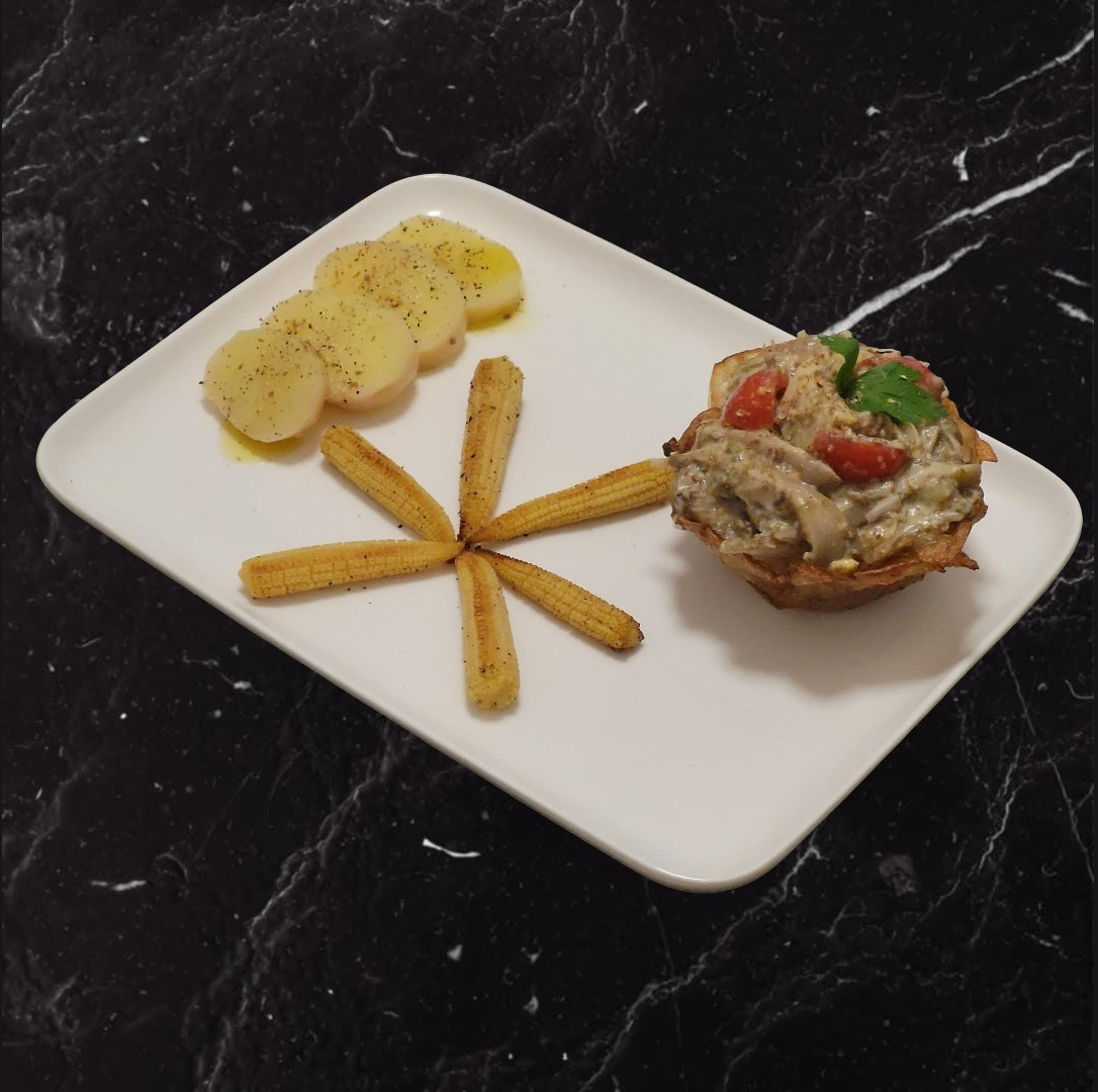 Per questo ceviche, ho utilizzato i funghi pleutotus ed il jackfruit come base e infondo la marinata con alghe per l’umami e per sfruttare quel sapore oceanico.