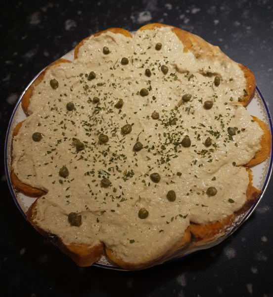 Prendete il fondo di cottura , i ceci, lo yogurt, i capperi, la tahin, alga kombu ammollata, la senape , il sale e il limone e frullateli sino ad ottenere una consistenza morbida.