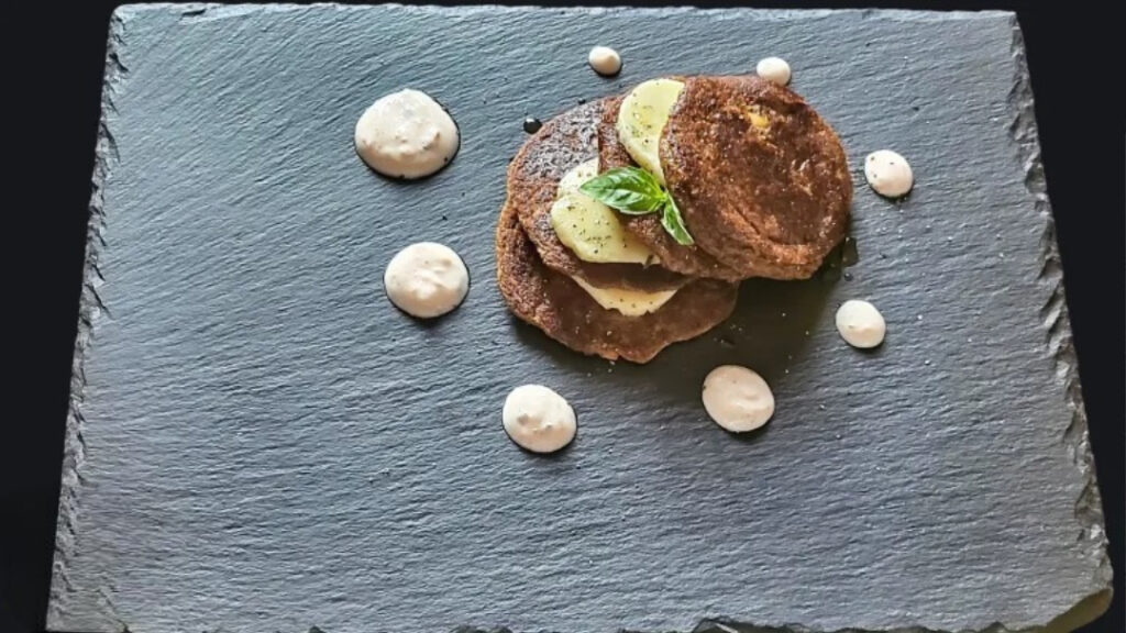 4 Impiattamento : Formare dei cerchietti di yogurt che posizioneremo tutte intorno al nostro piatto da portata.Al centro posizionare i nostri pancake intervallati da rondelle del nostro burro aromatizzato.Finire con un giro di salsa allo yogurt e di olio evo e una spolverata di pepe.Finire con delle foglie di basilico.