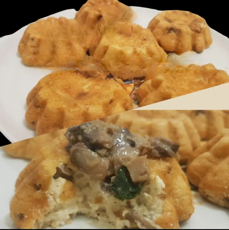 Frullate le patate con il lievito alimentare, la panna di soia, la farina di ceci e una generosa presa di noce moscata grattugiata. Regolate di sale, incorporate metà dei funghi , il lievito e, delicatamente, l’aquafaba montata a neve ben ferma con una punta di cremor tartaro.