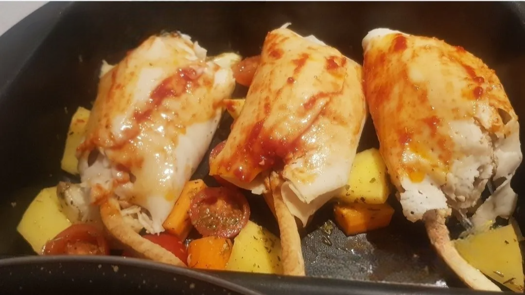 - Sciacquare accuratamente le patate e le verdure, quindi tagliare le patate a spicchi e le verdure a striscioline spesse.Versare l’olio aromatizzato con tutti gli aromi e stendere su una teglia.Mettere le cosce sopra le verdure e mettere la teglia in forno sulla griglia centrale e cuocere per 30 minuti. Spennellare ancora con la nostra marinatura e cuocere per altri 20-30 minuti fino a ottenere il colore desiderato della pelle e le cosce di pollo vegane siano ben croccanti.