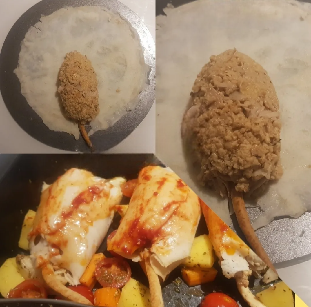 ASSEMBLAGGIO COSCE DI POLLO VEG :Su un tagliere stendi un foglio di carta di riso precedentemente bagnata , spennellandola con dell’acqua o ammollata per qualche secondo in una ciotola di acqua e incidiamo con un coltello metà del diametro.Prendi un grissino ( il nostro osso ) e posizioniamolo adiacente al taglio in modo che fuoriesca dal perimetro del foglio di riso di qualche centimetro e q.b. , prendiamo 1/8 di polpa di jackfruit e granulare e forma una coscia attorno al bastoncino, lasciando naturalmente che l’osso sporga dalla carne.Avvolgi la carta di riso bagnata attorno alla coscia per creare la sua pelle.Se non vuoi fare i grissini , puoi naturalmente comprarli o puoi usare invece degli spiedini di legno o dei bastoncini di gelato in legno o delle bacchette cinesi.Mescolare insieme tutti gli ingredienti per la marinata. Spennellate generosamente le cosce con la marinata.