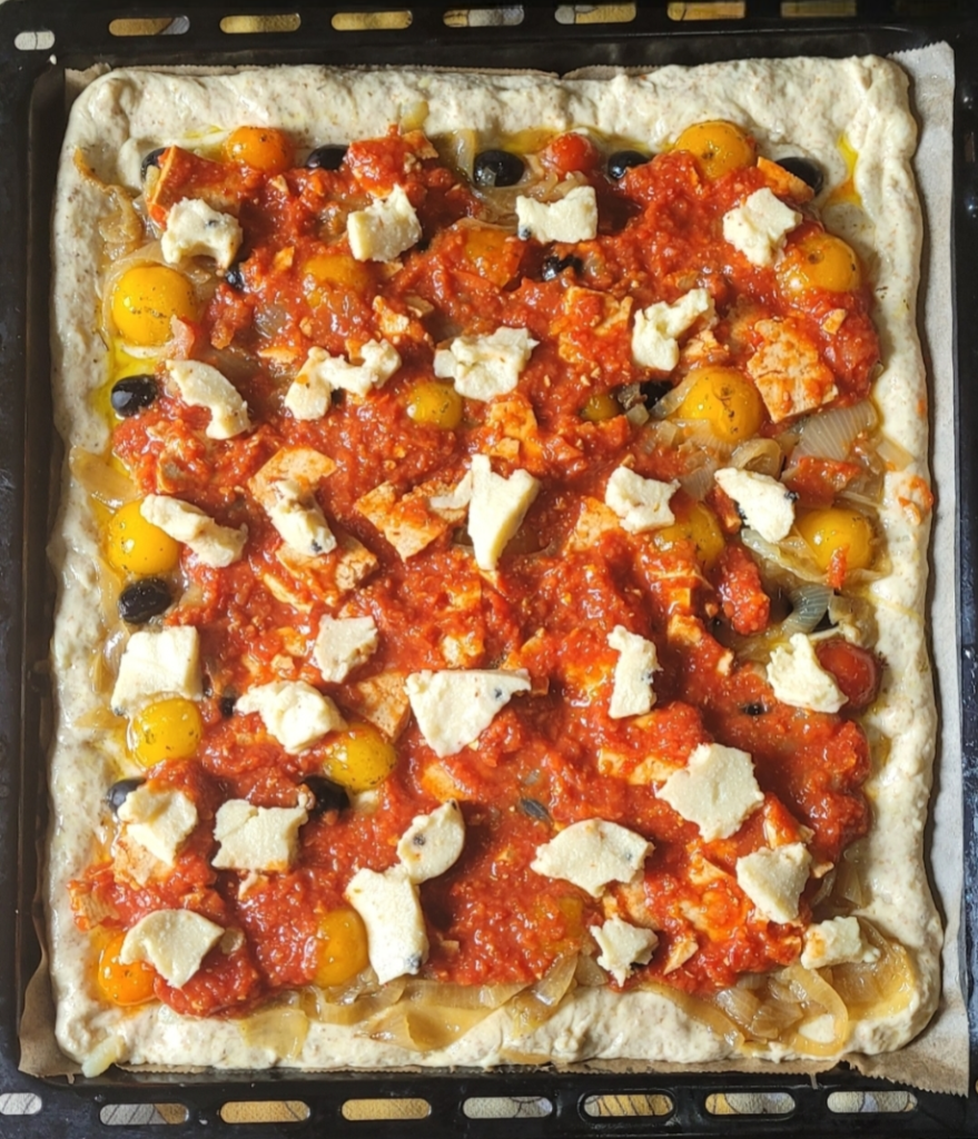 - CONDIMENTO : Nel frattempo Marinare il tofu barbecue: Aggiungere entrambe le salse ed il tofu pressato in una ciotola e lasciare riposare fino al momento dell’uso.Tagliate a metà i pomodorini, conditeli tutti insieme in ciotola con sale, olio e origano. Metti a strati le cipolle ( le cipolle io le ho fatte saltare prima in padella con poco olio e poi ammorbidite con poca acqua) e le olive . Cospargere di sale e peperoncino. Aggiungi il tofu marinato con le salse . Cospargi la salsa barbecue sriracha rimanente sul tofu. Aggiungi una quantità sufficiente di Formaggio Pepper Jack tritato .Usate forno statico, 200° ben caldo. Posizionate la teglia sul fondo del forno a contatto se volete il bordo bello croccantino e lasciate cuocere 12 minuti circa se la teglia è piccola ,15 minuti se l’avete preparata nella leccarda da forno. il bordo deve colorirsi leggermente.Trasferite quindi la focaccia barese nella parte medio alta del forno e azionate subito il grill, lasciate cuocere altri 6- 7 minuti se la teglia è piccola, altri 10 -12 minuti se è grande.Attenzione che come sempre, minuto in più o in meno dipende dal proprio forno! . Tira fuori la Focaccia affettare e servire!