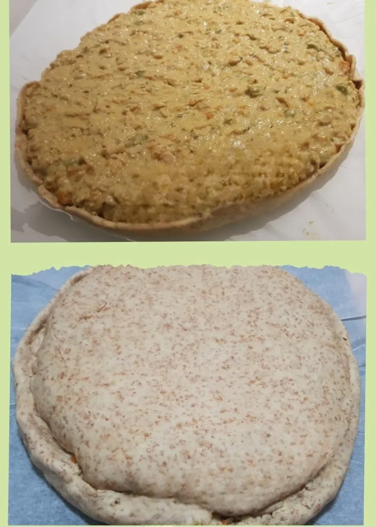 Trasferite il primo disco di pasta all’interno della padella/tegame di 28 cm e farcitelo con il composto di tempeh .