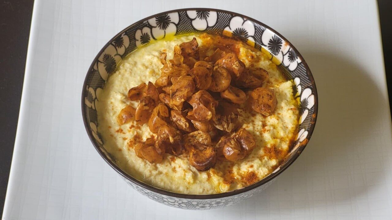 - Impiattamento:Metti l'hummus in una ciotola, fai un incavo col cucchiaio, versa un filo d'olio a crudo e ricopri con la pioggia di bucce croccanti.