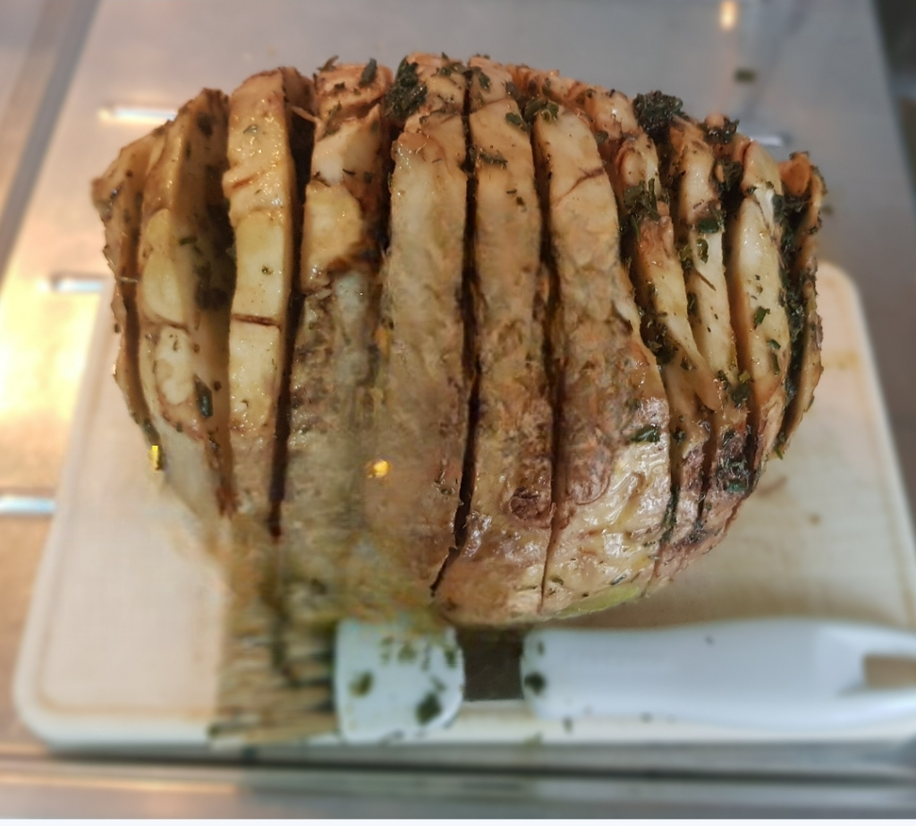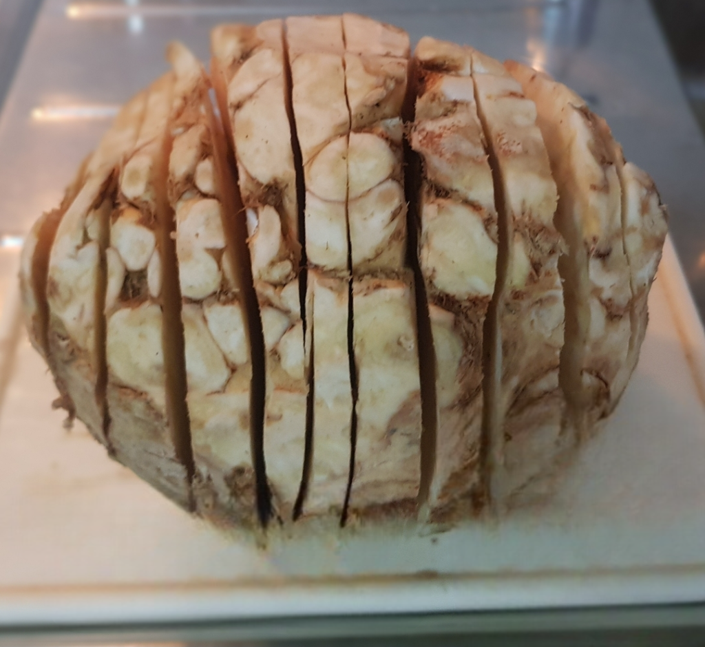 Una volta pulito e lavato incidiamolo profondamente (tagliandolo quasi a fette, ma lasciando unita la base il nostro sedano rapa assomiglierà quasi ad così una specie di fisarmonica).