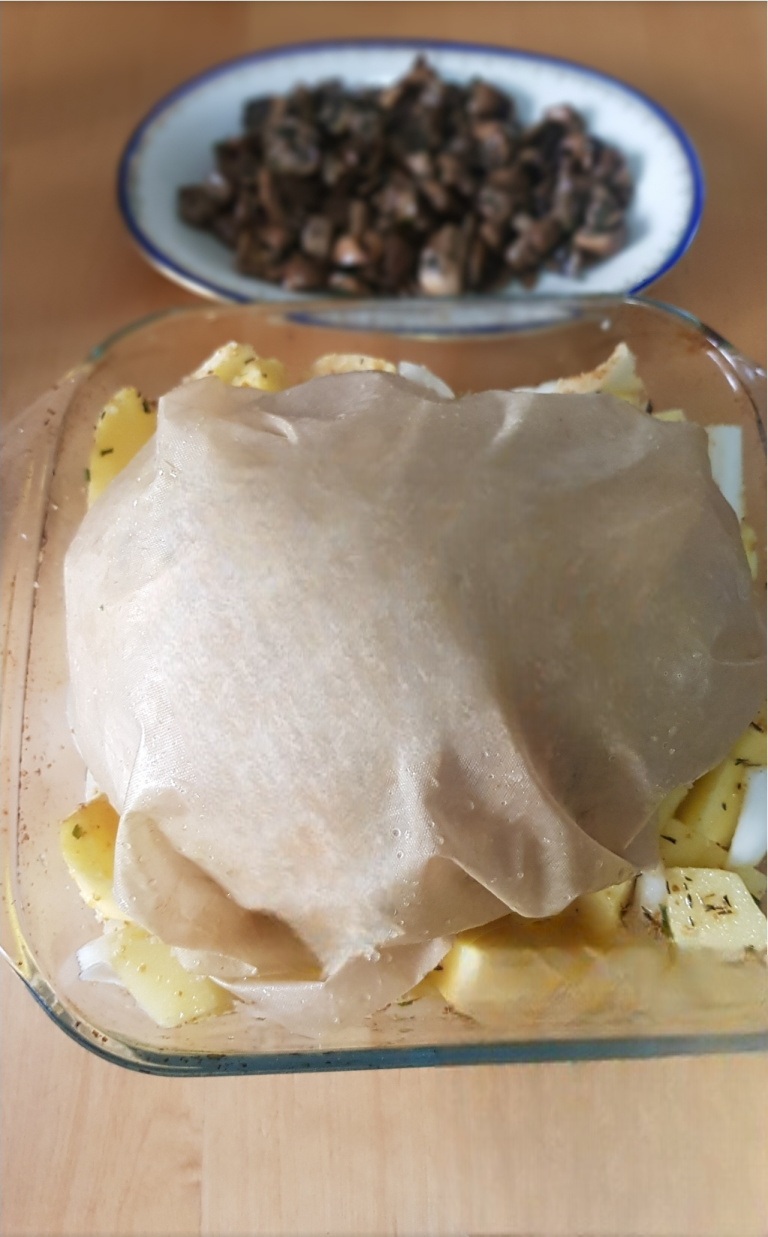 Incartiamolo bene nella carta da forno e infiliamolo in forno a 220 gradi per almeno un’ora.( io l’ho cotto in forno per 1 ora e 40 minuti)A metà cottura controlliamolo e con un cucchiaio bagniamolo nelle parti asciutte con un po’ di sughetto formatisi… Finita la cottura, recuperiamo la salsina dalla carta forno, allunghiamola con un po’ di acqua e vino e addensiamolo in un pentolino con un pochino di farina di semi di carrube aggiustando di sale: questa sarà la vera chicca per il vostro arrosto! Serviamo le fette tiepide e con la cremina ottenuta addensando l’olio di cottura. Io l’ho accompagnato con una bella dadolata di patate al forno e funghi trifolati..!