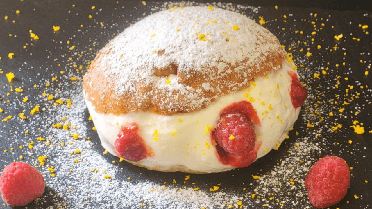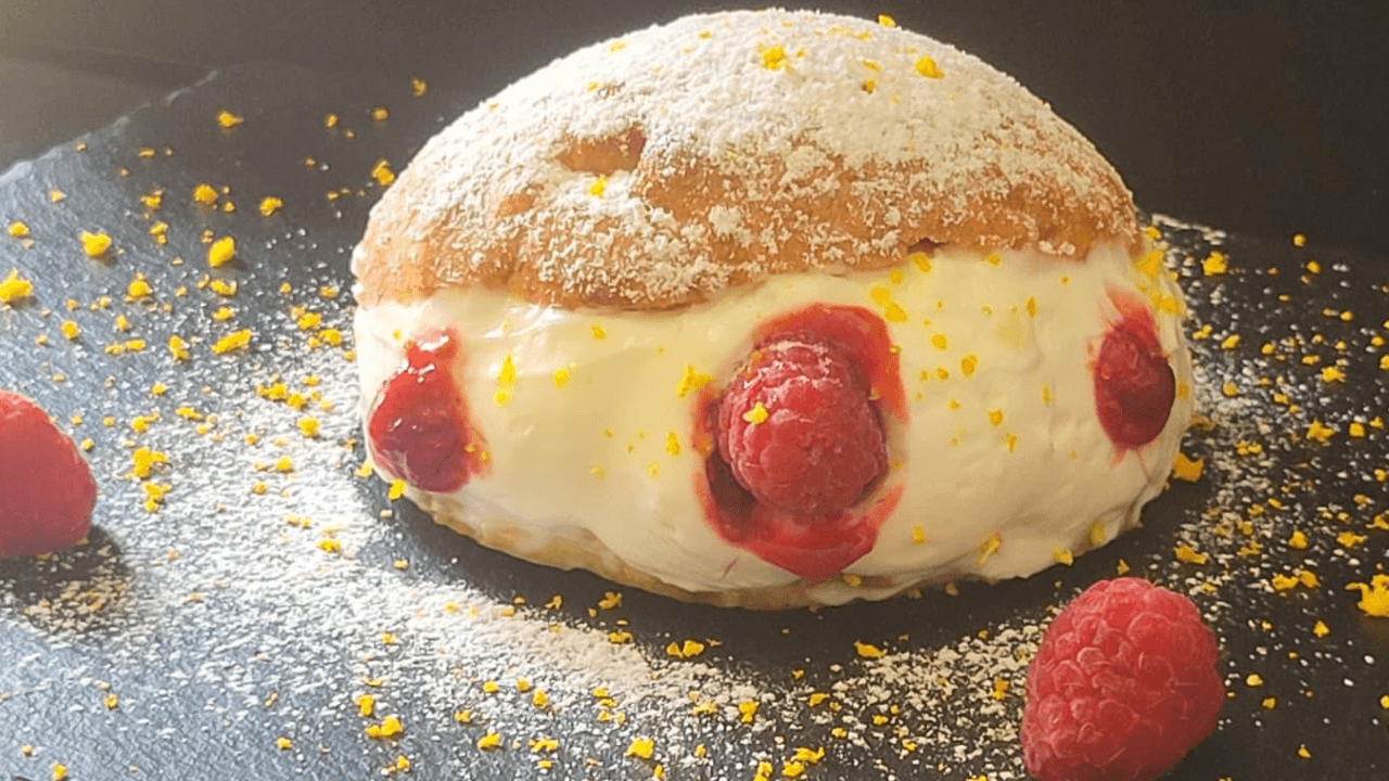 In questa versione, il soffice impasto tradizionale viene avvolto in un profumatissimo velo di zucchero all’arancia, che sprigiona un aroma agrumato a ogni morso. Ma la vera sorpresa è all’interno: un cuore profondo di lamponi, che rompe la dolcezza della panna montata con una nota quasi mielata.
