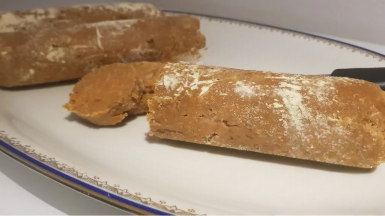 A questo punto aprite la carta forno, ripassate leggermente il salame nella farina di ceci,et voilà, il nostro salame vegano è pronto per essere mangiato.