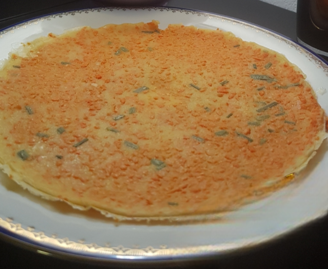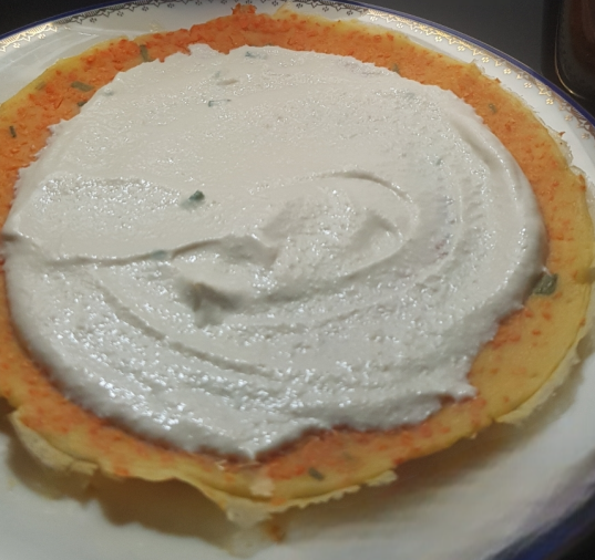 - Scaldate una padella antiaderente,Distribuite la carota grattuggiata uniformemente e quindi versate un mestolo di impasto in modo da formare uno strato di circa mezzo centimetro. Tenete presente infatti che la frittata vegana a differenza della tradizionale non aumenta di spessore in cottura.