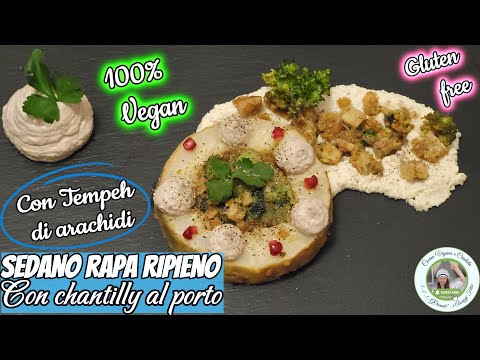 Potrebbe sembrare una preparazione leggermente asciutta, ma in realtà la parte integra di sedano rapa ben cotto con il tempeh compatto e la chantilly sopra al melograno,porcini e Porto creeranno un piacevolissimo mix al palato che renderà tutto piuttosto appetitoso e poi infine lo serviremo su una purea dello stesso sedano rapa che abbiamo svuotato .