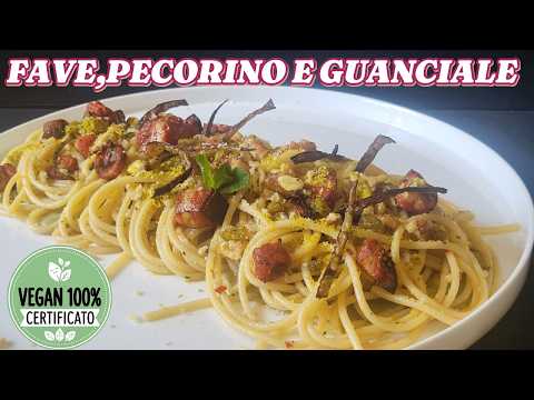 Spaghettoni con fave,pecorino e guanciale , classico primo romano in versione vegana e moderna