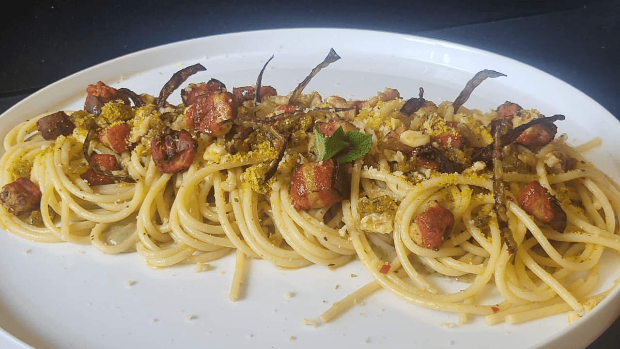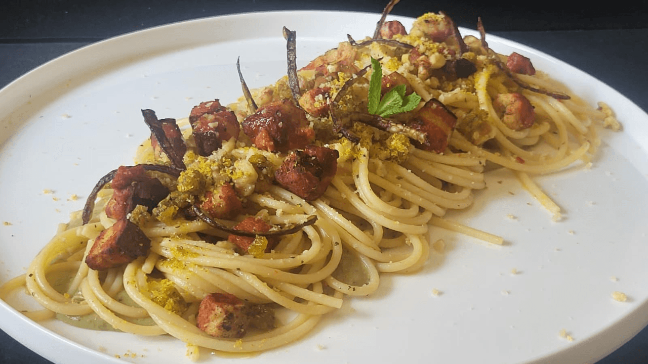 Il segreto? Un crumble di grissini di riso e noci tostato nel fondo del guanciale, per una croccantezza che non ti aspetti. Un piatto 100% vegetale, romano nell’anima e gourmet nell’estetica, pensato per chi non vuole rinunciare a nulla.