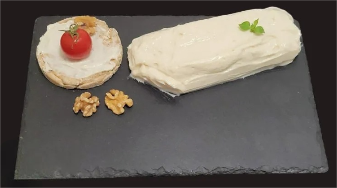 Tataki di bistecchine di soia ,con tartare di pomodori e mousse di stracchino, battuto di olive e bottarga, crostini di patata rossa con stracchino piccante