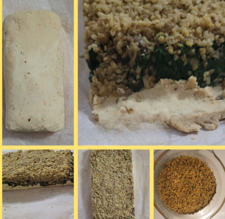 Il ripieno è composto da tre strati: spinaci con aglio, funghi shiitake saltati , riso e lenticchie , questi ultimi che con l’aggiunta di altri ingredienti e tritati grossolanamente avranno la consistenza della carne macinata.
