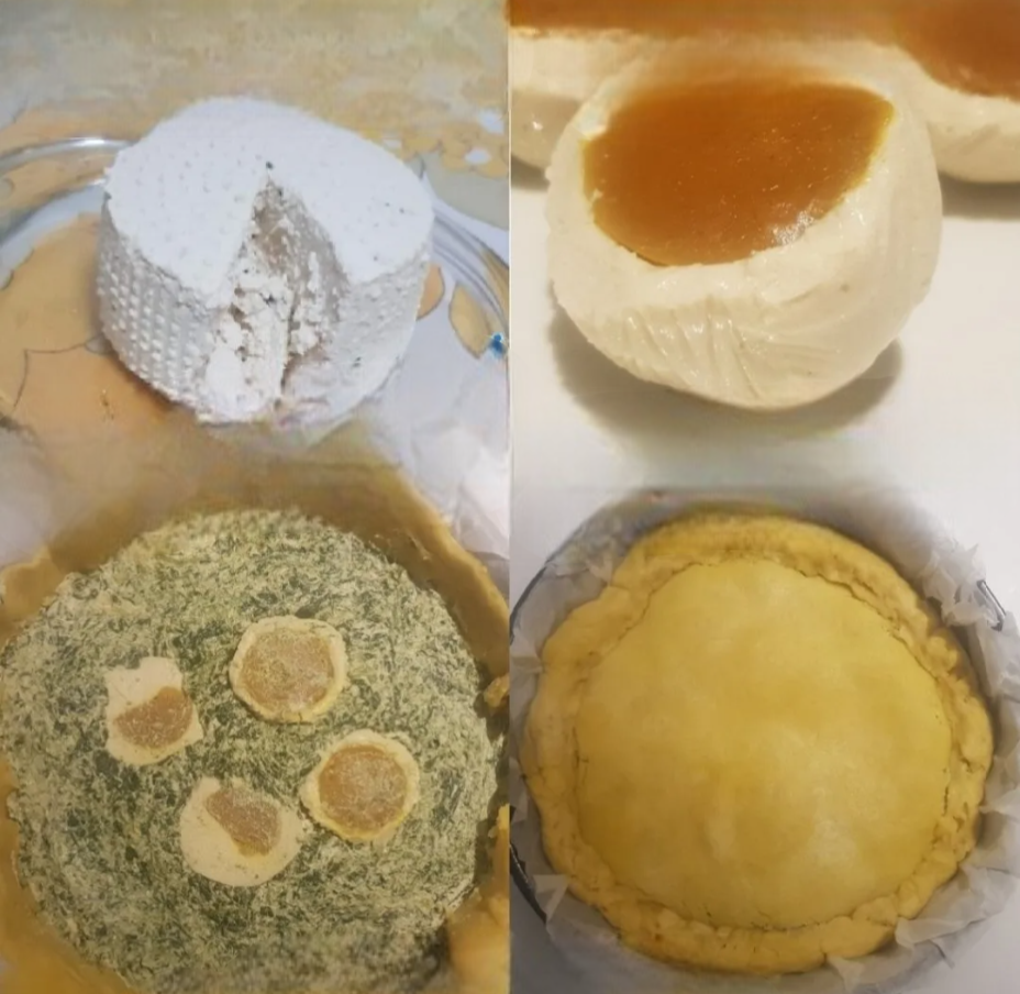 - Per la Farcitura :sbollentiamo gli spinaci per 10 minuti in acqua leggermente salata. Quindi scoliamo, lasciamo intiepidire e strizziamo molto bene.Saltiamo gli spinaci con uno scalogno tritato , aggiungere acqua , e facciamo amalgamare fino a che l’acqua non si è asciugata tutta, facciamo raffreddare.Per il ripieno della torta Pasqualina vegana lavoriamo bene la ricotta di soia e l’amido di mais con una forchetta, quindi aggiungiamo il formaggio vegano grattugiato, il sale e la noce moscata. Non appena il composto sarà ben amalgamato uniamo gli spinaci leggermente tritati al coltello.Foderiamo uno stampo di 24 – 26 cm di diametro con 1 foglio di pasta brisee generosamente .Riempiamo con 1/3 del ripieno.Posizioniamo le uova vegane ( creando dei buchi all’interno del ripieno con un cucchiaio )e copriamo col restante ripieno.Chiudiamo la torta con l’ altrofoglio di pasta brisee , bucherelliamo e ripieghiamo all’interno gli strati laterali.Inforniamo, in forno preriscaldato ,a 180 °C per circa 25 minuti , poi a 200° per 10/15 minuti .Attendiamo che la torta Pasqualina vegana raggiunga la temperatura ambiente prima di sformarla ( meglio cuocerla nel primo pomeriggio e servirla a cena), porzionarla e servirla.