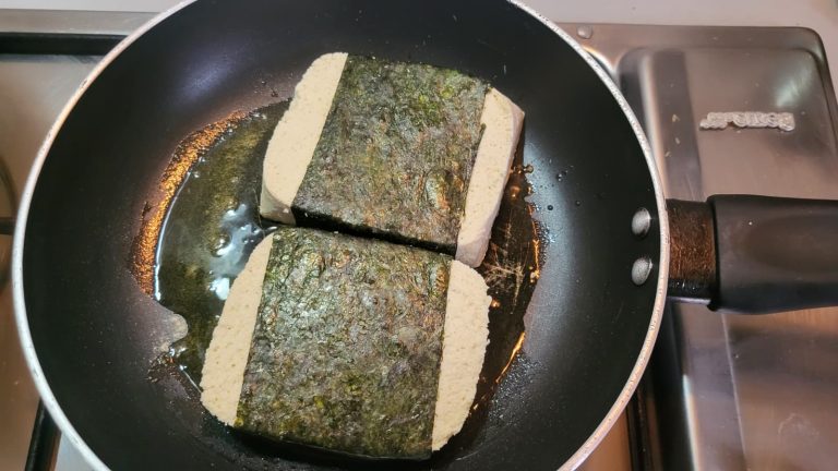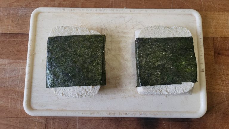 - Prepara il Tofu (Aroma di Mare): Asciuga bene il trancio di tofu. Pratica 2 o 3 tagli superficiali obliqui sulla parte superiore. Avvolgi il trancio nell'alga nori, sigillando i bordi con un po' d'acqua.